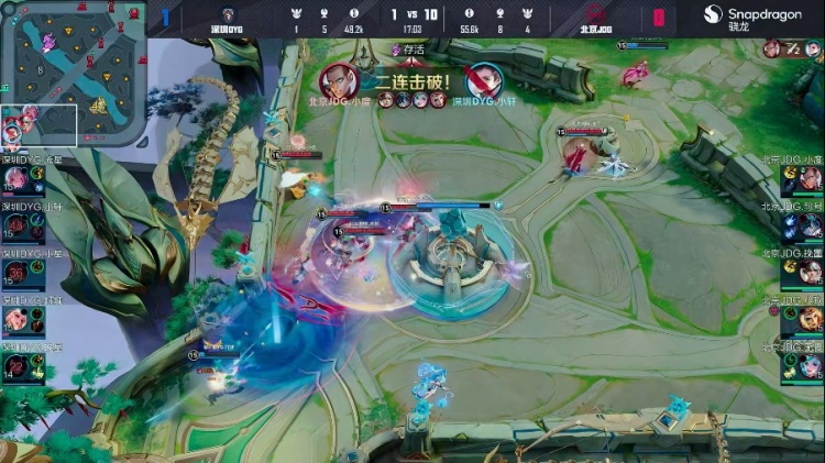 【10:20】下路安琪拉被JDG抓到,达摩收下安琪拉,随后阿离收下达摩打,但是侧面DYG上野也被JDG收下!