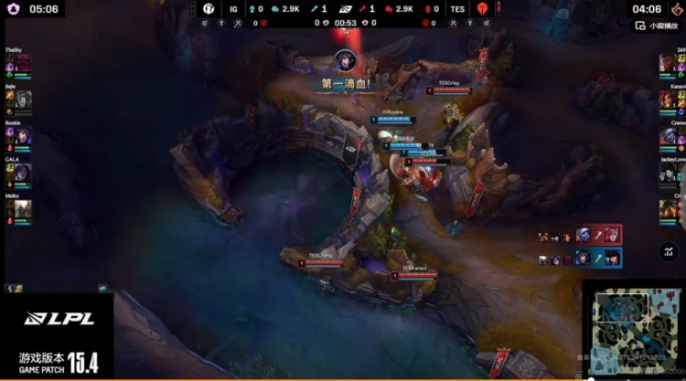 【0:53】iG抱团出击入侵野区强杀JKL女警,TES则是Creme小炮跳脸Jiejie蔚!最终Rookie阿狸拿下一血!双方1换1!