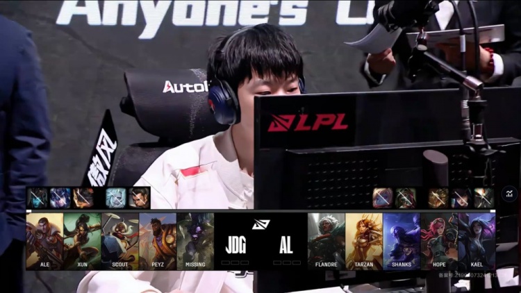 蓝色方JDG:Ale奎桑提、Xun豹女、Scout杰斯、Peyz飞机、MISSING牛头