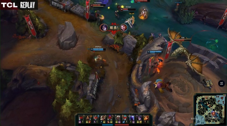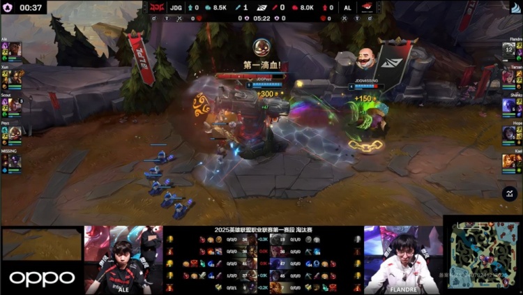 【5:15】半血Flandre在塔下被JDG双人组越塔对手,Missing牛头扛塔让Peyz飞机吃掉一血。