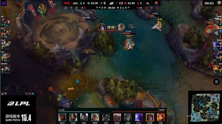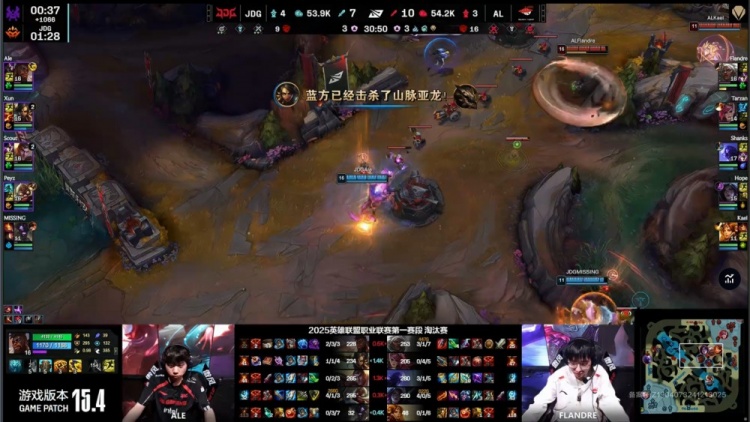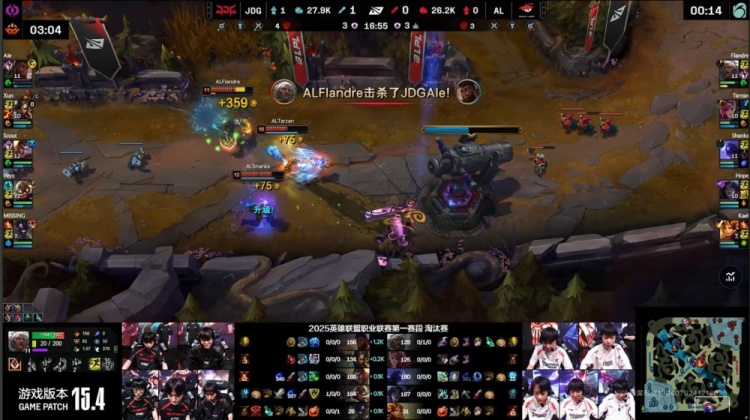 【18:25】Missing牛头下路顶出Kael闪现,JDG推掉AL下路一塔,随后JDG中路放出先锋撞掉AL一塔,二塔前Kael开团,Scout先被秒杀,Ale也被击杀,Xun要扑人被打出闪现,Shanks开车送队友三人上车飞脸将JDG剩余三人融化,AL打出1换5团灭JDG,双方经济持平。