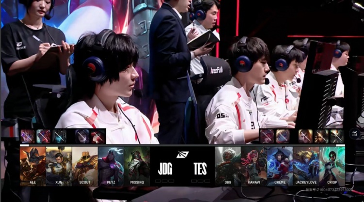 蓝色方JDG:Ale兰博、Xun赵信、Scout沙皇、Peyz韦鲁斯、MISSING烈娜塔