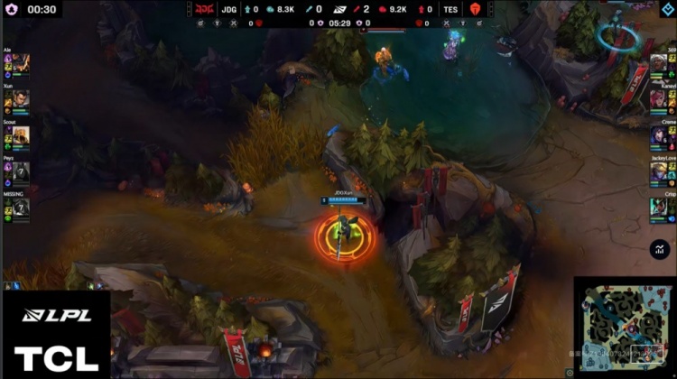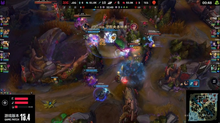 【34:02】JDG再吃小龙,双方均听牌炼金龙魂,JDG中下推进冲上TES高地,Scout推回Crisp后,TES中辅瞬间被融化,JDG打出0换4一波推平TES基地先下一城。