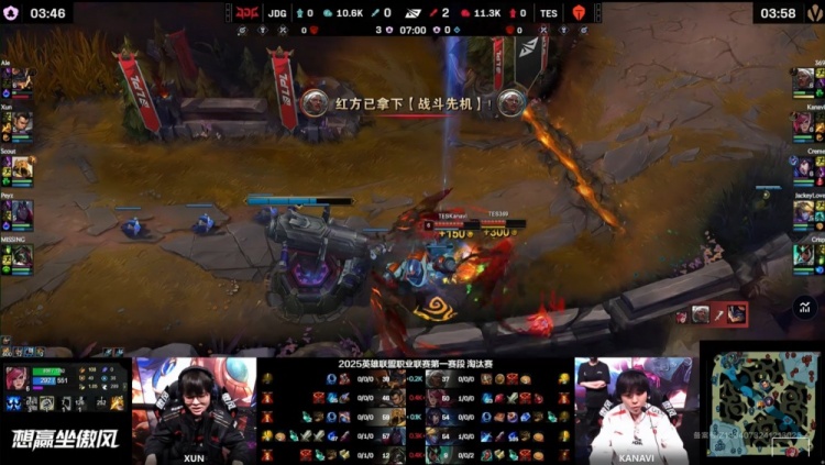 【25:14】TES中路推进,369安蓓萨+Kanavi进场锁头带走Peyz,Missing随后也跟着阵亡,Ale大招洒下,Xun带走Kanavi后再杀哥哥拿到双杀,双方打出2换2,JDG吃掉大龙。