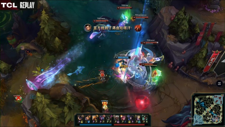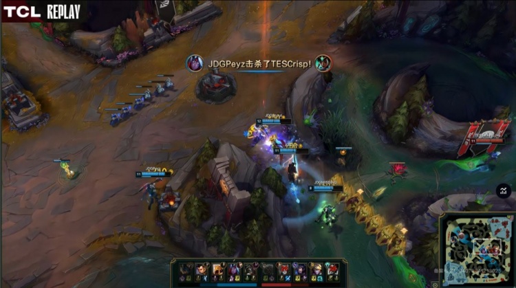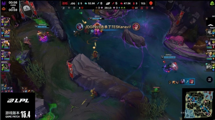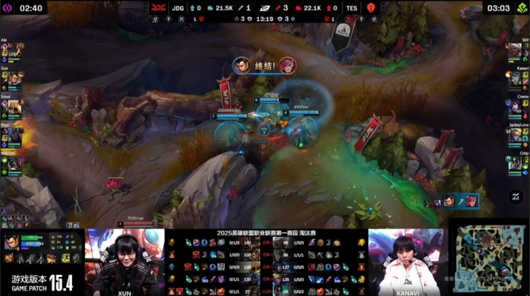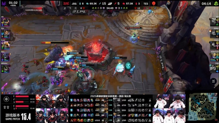 后期Kanavi晕头转向连续被抓阵亡,JDG再吃大龙,一波推上TES高地打出0换4,推平TES基地先下一城。