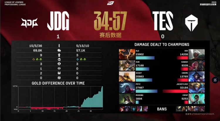 中期TES中路推进,Peyz遭TES上野双锁头瞬间被融,但Xun赵信冲进人群拿到双杀,JDG趁机吃掉大龙,Xun再抢渴血厄塔汗得手,JDG瞬间推掉TES中下两座二塔,将经济优势扩大到5k。