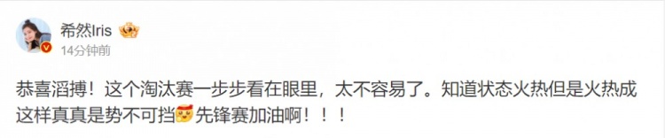 希然:恭喜滔搏!这个淘汰赛一步步看在眼里,太不容易了。知道状态火热但是火热成这样真真是势不可挡,先锋赛加油啊!!!