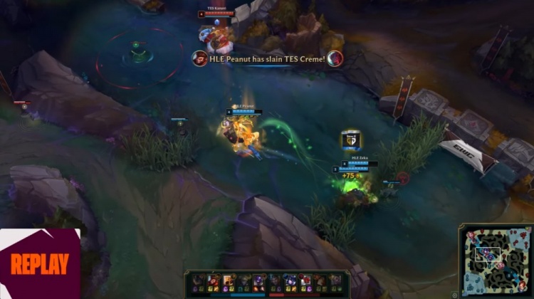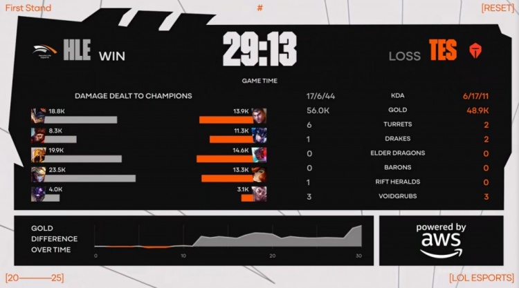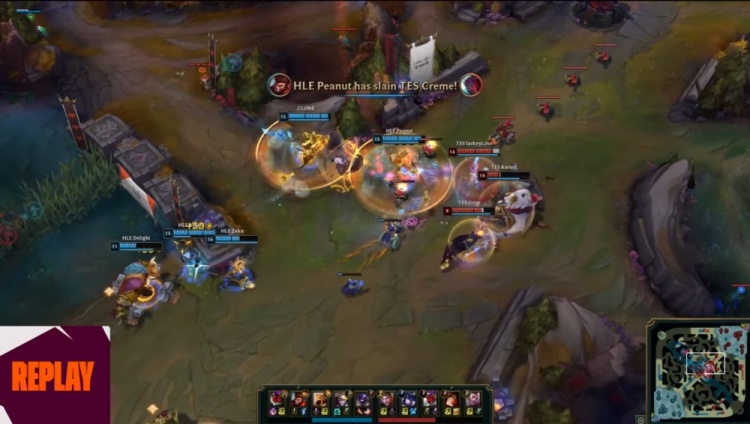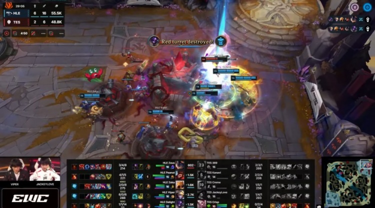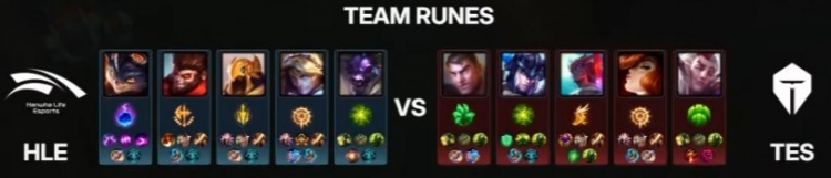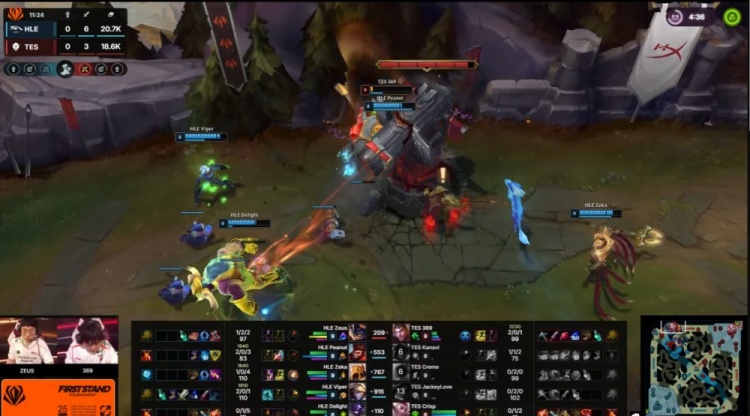 中期河道团战,Viper进场双杀。HLE随后轻松吃掉灭尽厄塔汗,Kanavi小猪冲脸开团被秒,哥哥扫大终于带走Zeus。后期大龙团Zeus兰博完美大招接Zeka沙皇推哥哥,TES瞬间爆炸光速被HLE团灭,HLE上路轻松一波推平TES基地先下一城。