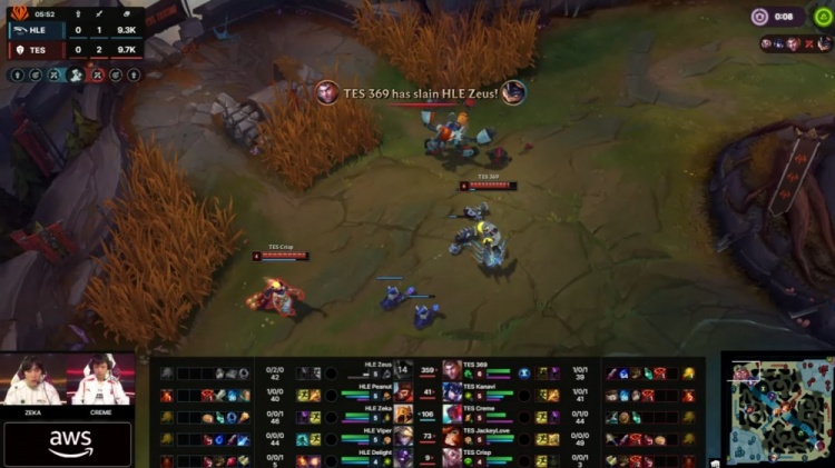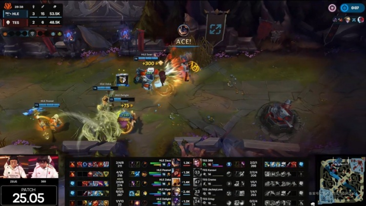 【10:52】河道团战,Kanavi送Zeus兰博大人头,Creme被Viper跟上一发Q带走,Delight留住刘神让Zeka吃头,369塔下孤立无援被HLE四人越掉,HLE打出0换5团灭TES,经济领先3k。