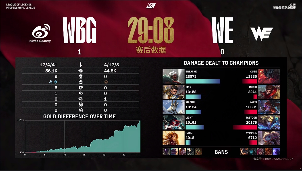 直播吧3月22日讯 LPL第二赛段WBG击败WE,WE打野Monki本局猴子仅打出3241的全局伤害。