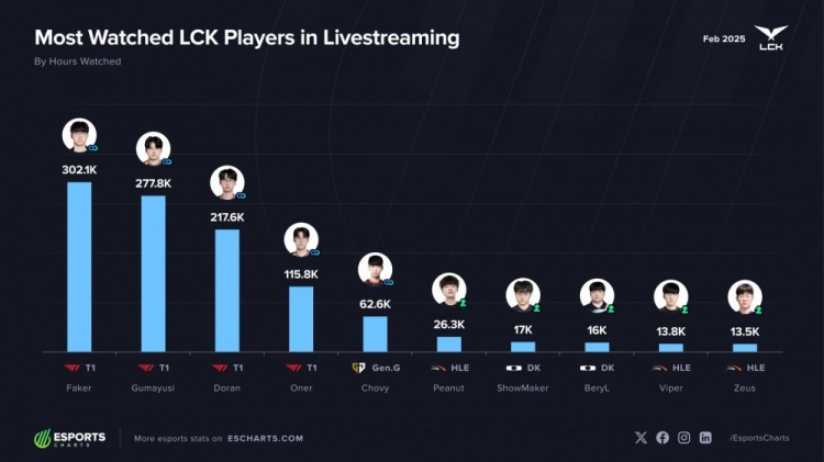 直播吧3月23日讯 2025年2月直播最受欢迎的LCK选手排名公布,T1包揽前四!