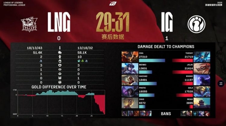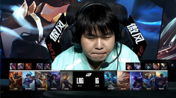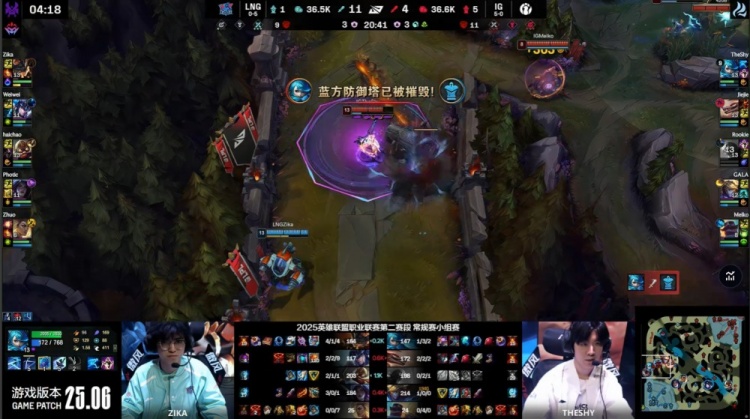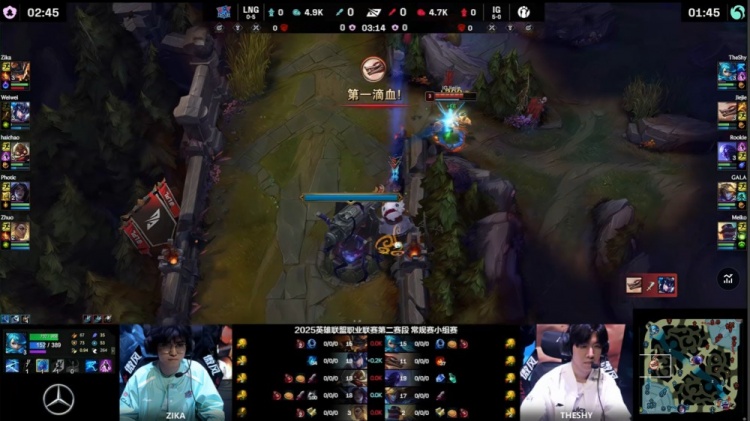 中期LNG四人下路逮捕Rookie,但iG兵分两路推掉LNG中路高地塔与上路二塔,经济反超1k。TheShy上路又被Zika单杀,正面团战GALA被Photic切掉,LNG吃掉灭尽厄塔汗,TheShy复活再送haichao人头,双方经济持平。