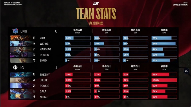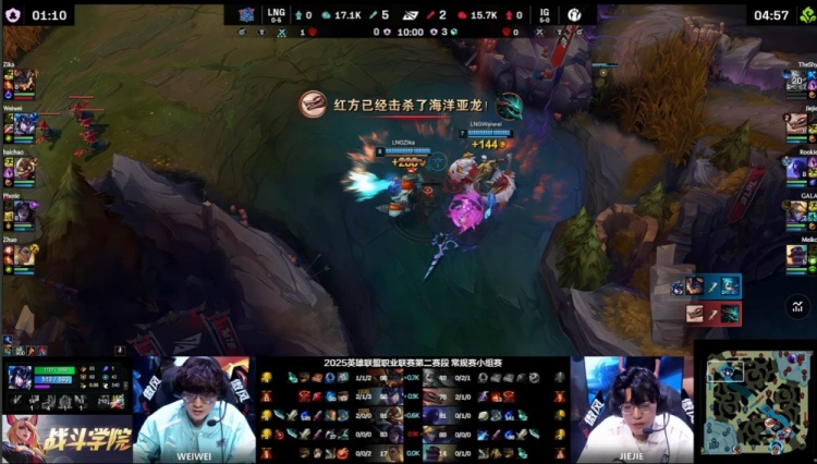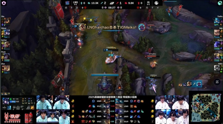 前期Weiwei小猪打蓝被Jiejie狗狗逮捕,野区团战Zhuo芮尔开iG两人,haichao斩获双杀,随后Weiwei去上击杀iG上野拿到双杀,Meiko布隆连续阵亡,LNG打出1换3拿到2k经济优势。