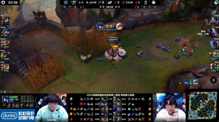 【16:13】河道Zhuo再开Meiko,后者再次阵亡,TheShy河道1v3,GALA带走Weiwei,但TheShy与Jiejie被杀,LNG打出1换3,经济领先1k。
