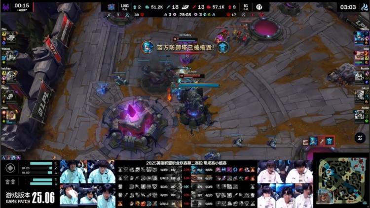 【20:01】Rookie下路砸兵被LNG四人追杀,iG推掉LNG中路二塔,GALA中路带掉LNG高地塔,TheShy上路带掉LNG二塔,iG经济反超1k。