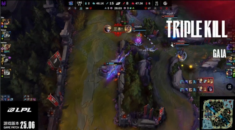 【25:41】野区团战,Jiejie勾过冲进人群,GALA带走Weiwei小猪,TheShy格温侧面狂剪,GALA狂轰三杀,iG打出0换3回头吃掉大龙,经济领先2k。