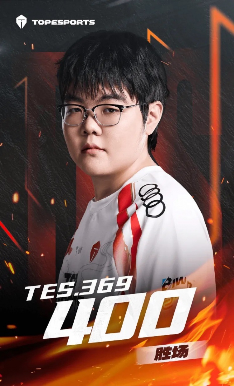 在刚刚结束的对局中,TES上单选手369拿下了自己LPL职业生涯的第400场胜利!