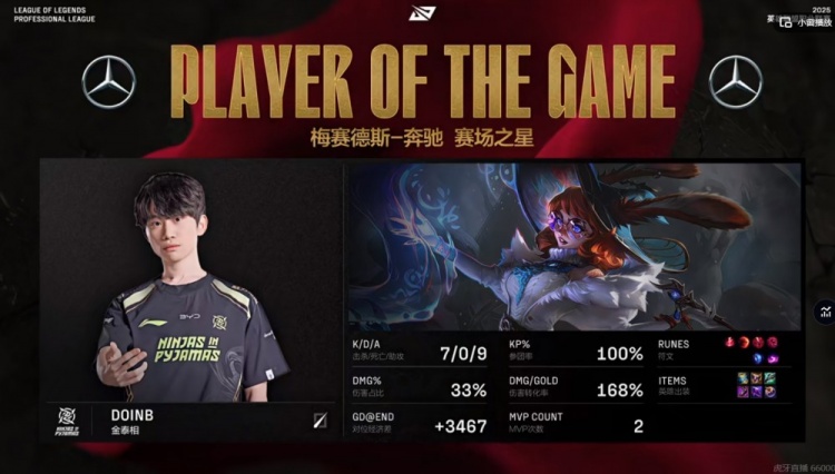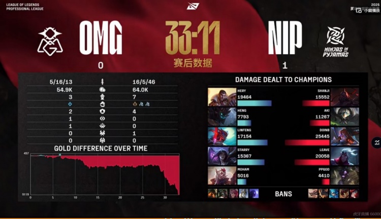 本局比赛对线期Doinb阿萝拉开局配合AKi蔚击杀掉了Linfeng永恩,6分钟巢虫团NIP双C收割帮助队伍打出优势!中期OMG运营让Linfeng永恩补充发育,还一度抱团偷掉了灭尽厄塔汗将比赛往后拖!但是关键时刻Moham洛急于开团白给,Starry卡莎开飞后排切残血斯卡纳未果自己白给!NIP打出0换3之后拿下大龙拉开经济差!随后又是Heng大树白给送出NIP一路高地!最后一波团OMG顶着中一塔强开,再一次脱节被NIP集火强杀掉双C!NIP直接抱团一波结束比赛!