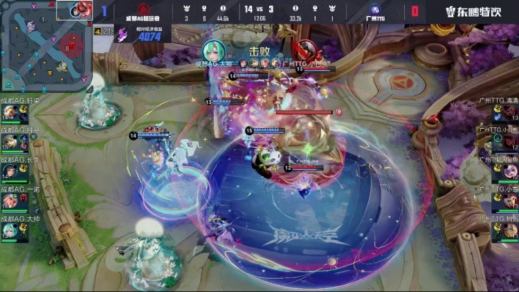 【12:10】AG上路带着兵线推进,曹操被AG开到击杀,随后AG直接选择强行一波团灭TTG拿下胜利!