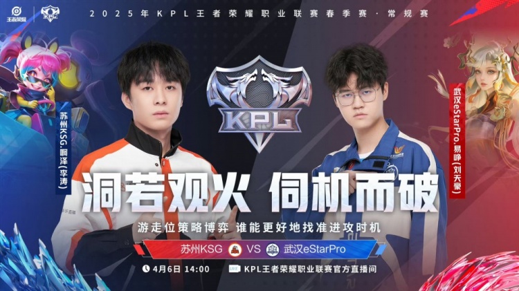 直播吧4月6日讯 2025KPL春季赛今日第一场吧比赛是由苏州KSG对阵到武汉eStarPro!