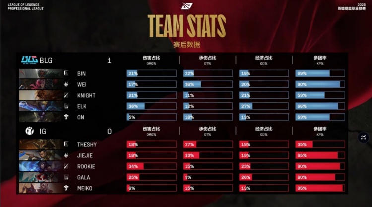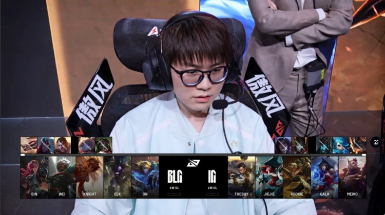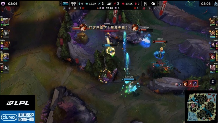 中期河道团战Rookie与jiejie迷路被杀,BLG吃掉厄塔汗,上路阿Bin被开knight岩雀开车来救送Rookie狐狸双杀,大龙团Jiejie卡三枪捅飞Elk让GALA吃到大人头,iG打出0换3回头吃到大龙,经济领先3k。