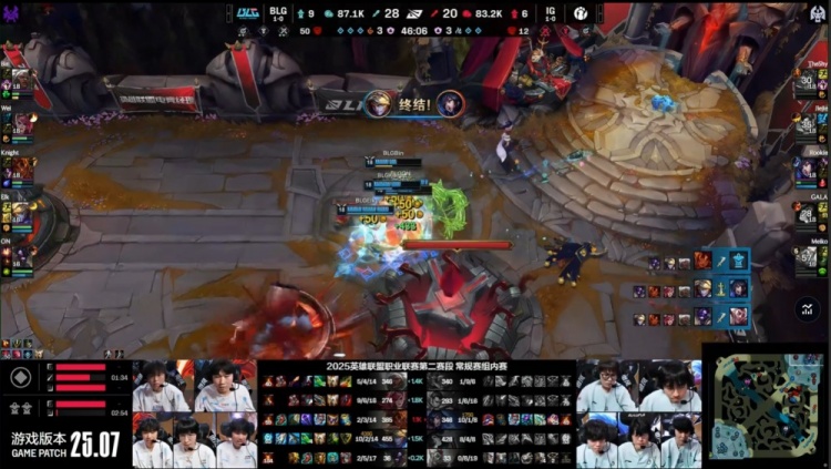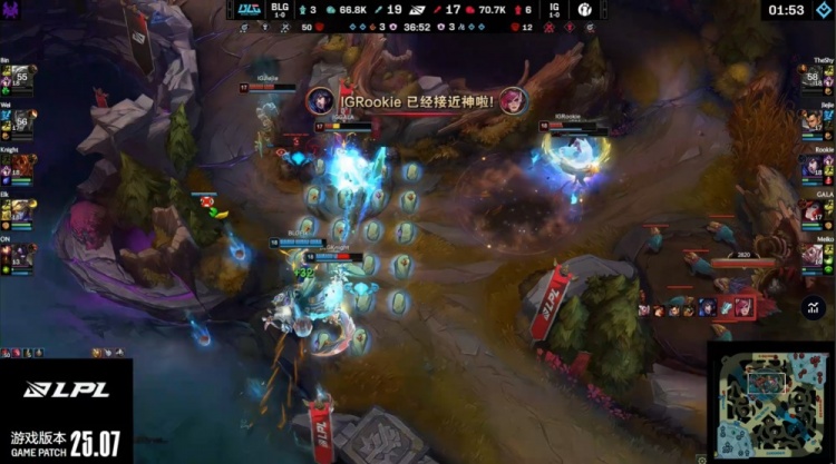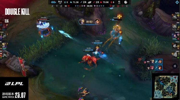 后期小龙团,Rookie再拿双杀,iG与BLG同时听牌电龙魂。龙魂团knight开车进人堆被秒,Elk强力输出双杀力挽狂澜狂轰16888伤害,GALA无人保护被秒,BLG打出2换4通吃电龙魂与大龙。远古龙团GALA瞬间被秒,iG兵败如山倒被BLG团灭,BLG推平iG基地先下一城。