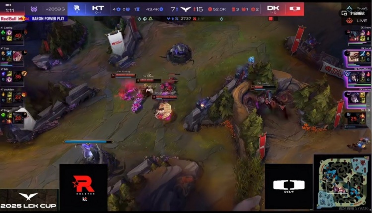 【25:05】Cuzz蔚大龙坑和BeryL泰坦脸贴脸直接吃了个大白给!KT集火收掉Siwoo剑魔,但是DK进场的纳亚菲利+阿狸根本没人管了啊!两人直接团战游龙!DK收割战局打出1换4,回头拿下大龙!KT转头rush掉了听牌龙!