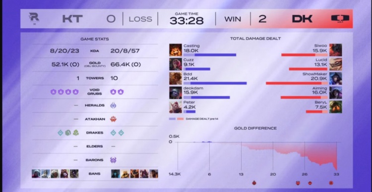 第二局ShowMaker阿狸对位猛压Bdd岩雀,14分钟小龙团deokdam小炮几乎没打什么伤害,Siwoo剑魔焚天大灭进场配合队友追击收割,这波DK击杀KT四人拿下4K的经济优势!KT轮换的二队上单Casting本局的纳尔也没啥存在感!DK拿下渴血厄塔汗之后直接站上高地送出三个复活甲,但是正面双方经济差已经被拉开到了一万以上!大龙团KT强开DK野辅但是双C第一时间赶不上!DK各个击破,1换5团灭KT结束比赛!横扫对手!