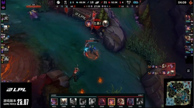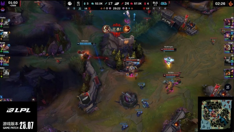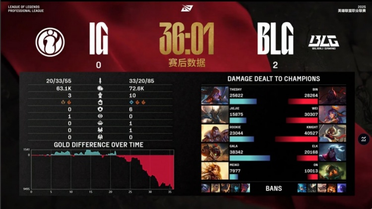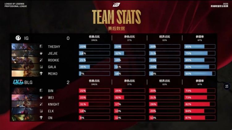 中期GALA中路被ELK韦鲁斯大招定住带走,小龙团Elk被jiejie潘森坐脸控住,Rookie一炮双响拿到双杀,阿Bin爆掉GALA也拿到双杀,BLG打出3换4,双方经济持平。随后jiejie中路继续跳Elk,Rookie再拿双杀,双方打出2换2。小龙团,Rookie下路绕后被发现遭到围殴阵亡,野区阿Bin同样被抓但赛恩开车逃生,Meiko野区绕后与队友四人包夹BLG三人,阿Bin赛恩TP埋伏草丛Q飞iG三人,Wei莉莉娅狂砍三杀,BLG打出1换5团灭iG吃掉大龙,经济领先4k。