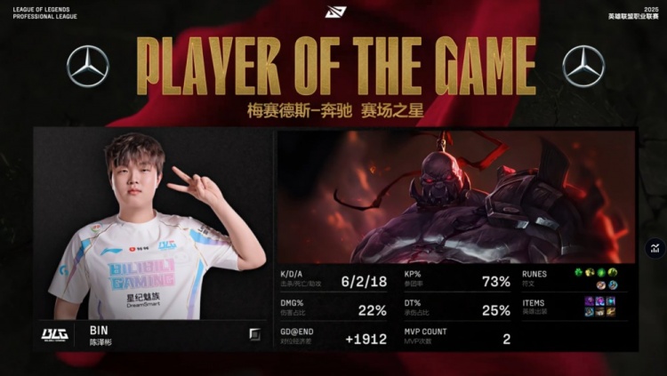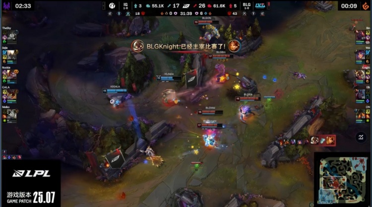 后期iG无法处理阿Bin赛恩,正面团战毫无一战之力,knight飞机疯狂杀戮,BLG冲上iG高地,knight三杀收尾,BLG推平iG基地拿到比赛胜利。