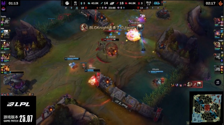 【23:28】中路jiejie继续开大跳Elk,Rookie再次双杀,Wei秒掉TheShy,knight飞机进场击杀jiejie,阿Bin进场双方拉开,双方打出2换2,BLG推掉iG中路一塔,经济领先1k。