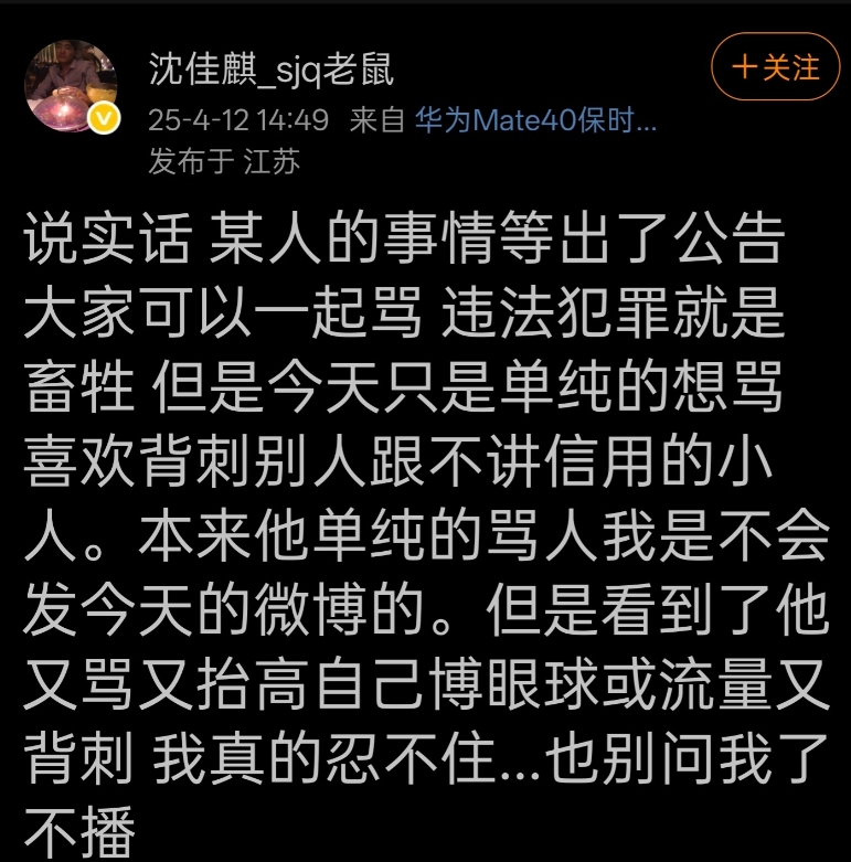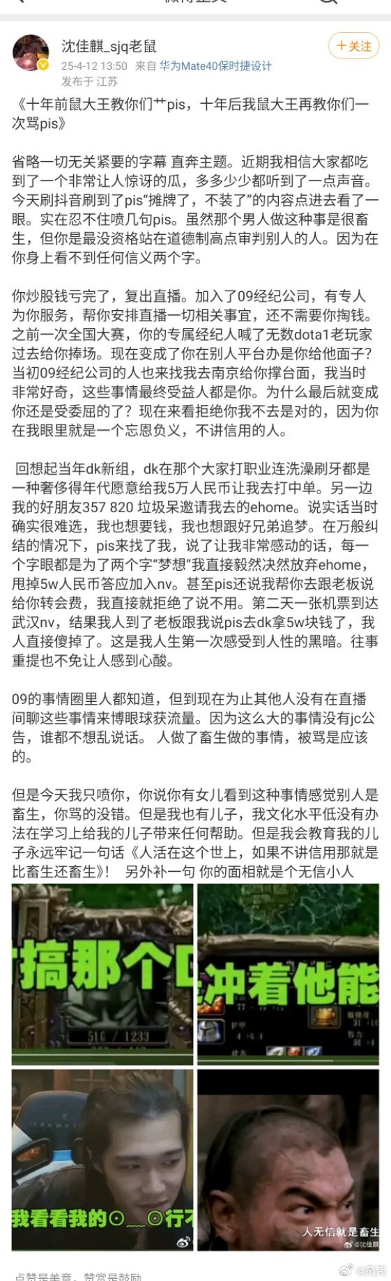 随后在今日前职业沈佳麒“鼠大王”更博怒怼Pis:忘恩负义不讲信用,虽然09做的事情很畜生,但pis是最没资格站在道德制高点批判的人;09对你雪中送炭,你对09落井下石。圈里谁都知道09的畜生事情,就你这小人在直播里来搞流量。