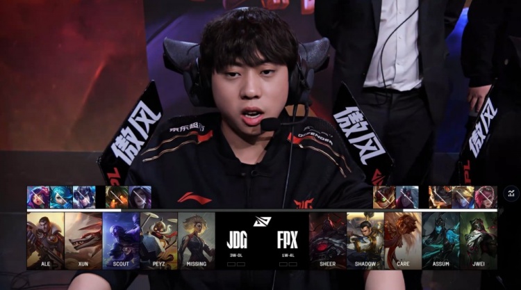 蓝色方JDG:Ale杰斯、Xun百裂冥犬、Scout瑞兹、Peyz飞机、MISSING芮尔