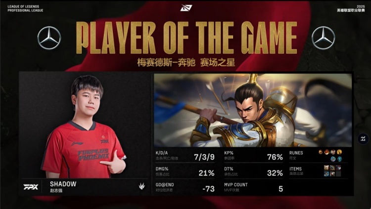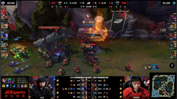 第一局前期Xun野区被抓被Shadow赵信单杀,FPX三人顺势越下带走Ale,上路2v2FPX两人线杀Peyz+Missing,双方经济差距不大。