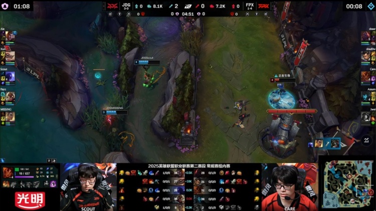 【36:28】FPX上路推进拔掉JDG高地塔,中路Care岩雀开车封路,Scout被打出金身交出双召拉开,JDG中路一塔被拔,FPX经济领先2k。