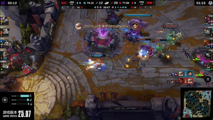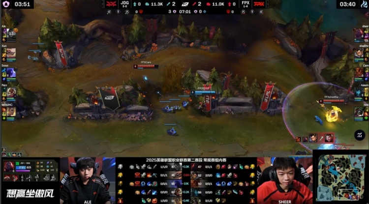 【14:27】Ale杰斯下路暴打Sheer赛恩追至塔下,sheer闪现躲开Ale杰斯 一炮,FPX众人支援到位带走Ale,JDG三人支援下路,Peyz飞机轰掉shadow赵信,双方经济差距不大。