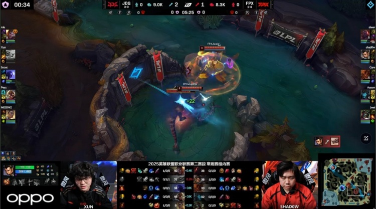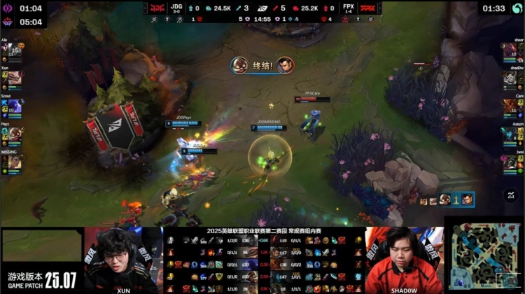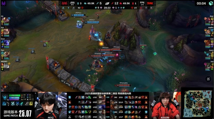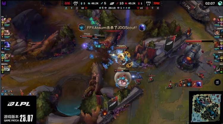 【25:58】Missing芮尔河道先被Shadow捅穿,野区Scout瑞兹绕后被发现送Assum卡莉丝塔大人头,FPX打出0换2,双方经济持平。