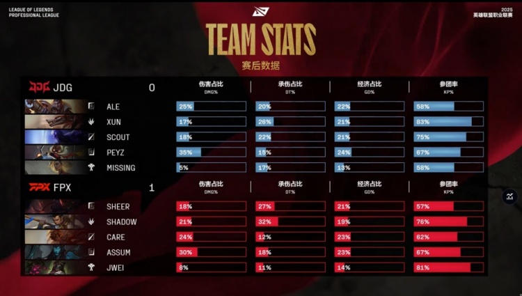 后期FPX吃掉水龙魂后野区团战打出0换3再吃大龙。后续Care中路砸兵被Xun逮捕送出一千大米,下路三角草Missing芮尔开FPX三人,Xun绕后融化Assum,JDG打出2换4拿到2k经济优势。但JDG连续放掉老龙与第二条大龙,FPX七龙珠不断推塔经济反超2k。最终FPX中路冲上JDG高地破掉三路,JDG再无一战之力惨遭团灭,FPX推平基地先下一城。