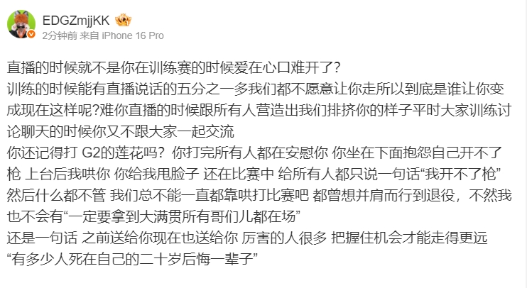 你还记得打 G2的莲花吗?你打完所有人都在安慰你 你坐在下面抱怨自己开不了枪 上台后我哄你 你给我甩脸子 还在比赛中 给所有人都只说一句话“我开不了枪” 然后什么都不管 我们总不能一直都靠哄打比赛吧 都曾想并肩而行到退役,不然我也不会有“一定要拿到大满贯所有哥们儿都在场”