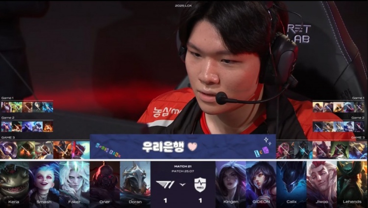 蓝色方T1:Doran赛恩、Oner佛耶戈、Faker维克托、Smash金克丝、Keria塔姆
