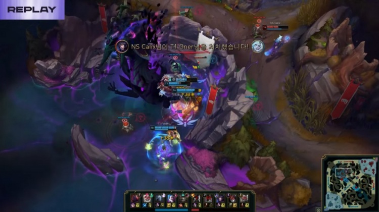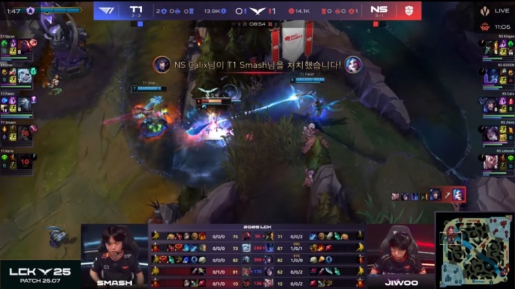 【8:42】Gideon梦魇关灯飞上配合Kingen船长开大,Gideon先杀Keria,Calix狐狸上路绕后换掉Smash金克丝但被Faker击杀,NS打出1换2。