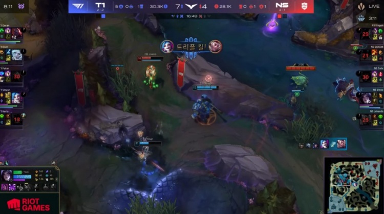 第三局前期Gideon梦魇关灯飞上配合Kingen船长开大打出1换2,巢虫团多兰赛恩开车撞飞NS三人,Smash金克丝狂轰三杀,T1打出2换3经济领先4k。中期T1中路推进秒掉NS上辅两人,大龙团多兰塞森再度撞飞Kingen,NS秒掉Oner想抢大龙未果,Smash吃掉大龙,T1打出1换3经济领先7k。最终T1平推NS基地拿到比赛胜利。