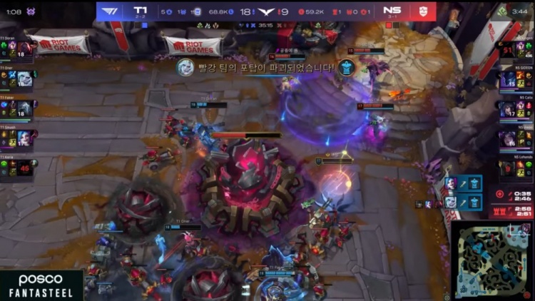 【34:37】T1上路推进,多兰再度发车撞飞Lehends,T1冲上NS高地,Smash点掉Kingen,T1推平NS基地拿到比赛胜利。
