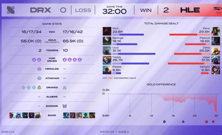 第二局比赛Zeus选出上单豹女,HLE前期也是帮助Zeka沙皇和Zeus豹女发育,但代价就是DRX连续针对到了Viper维鲁斯,让Teddy的伊泽瑞尔直接3-0开局!中期团战Delight机器人不是钩布隆斯卡纳就是塞恩,但是HLE中期输出不够秒不掉人,DRX连续团战不落下风,但是被Zeus豹女的单带+运营拉开了3K经济差!Zeus豹女下路单带高地拉扯,HLE正面四人逮捕塞恩之后拿下大龙!随后DRX两人再次逮捕豹女,但是HLE中路四人果断开团,ucal维克托姗姗来迟打残三个但是自己被HLE强杀!HLE团灭DRX一波结束比赛,有惊无险横扫对手!