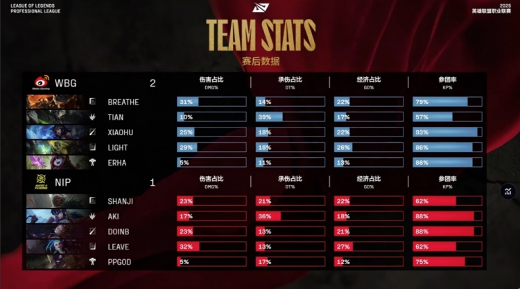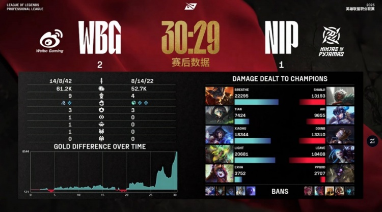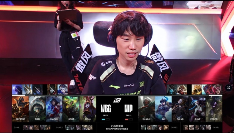 后期随后WBG中路推进,shanji安蓓萨锁头Light,Doinb与Aki瞬间接大融化Light,Leave金克丝双杀,NIP打出0换3。