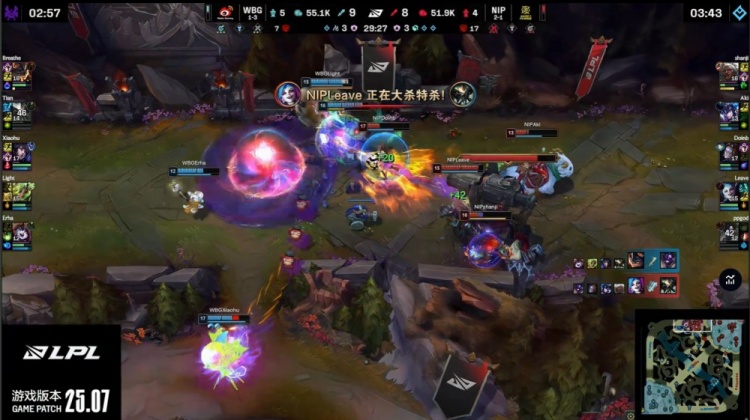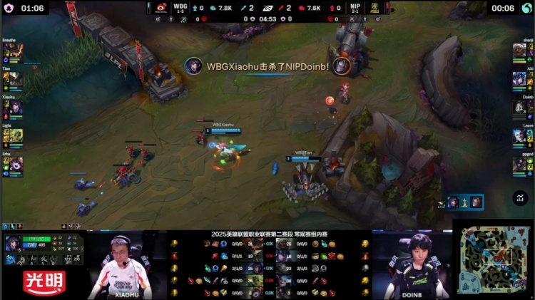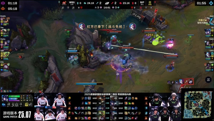 【25:47】WBG去开大龙,NIP过来接团,小天过墙上龙坑先被打出闪现,正面xiaohu亲到Leave将其秒杀,Doinb发条拉三人毫无伤害,WBG打出0换2继续开大龙,Aki抢大龙失败送出人头给到xiaohu,WBG经济领先4k。