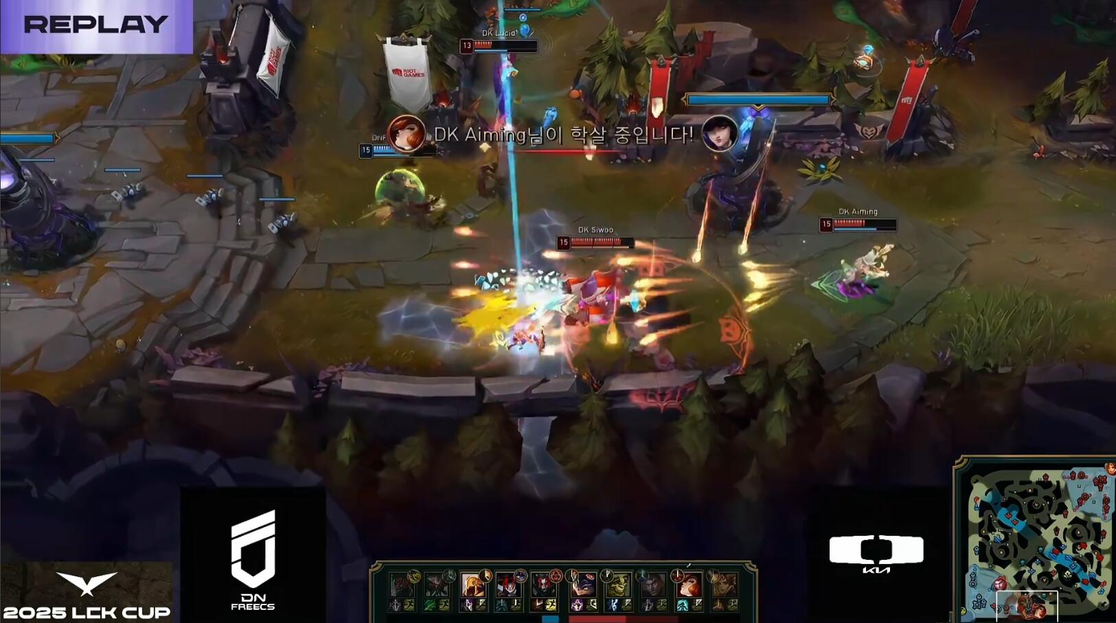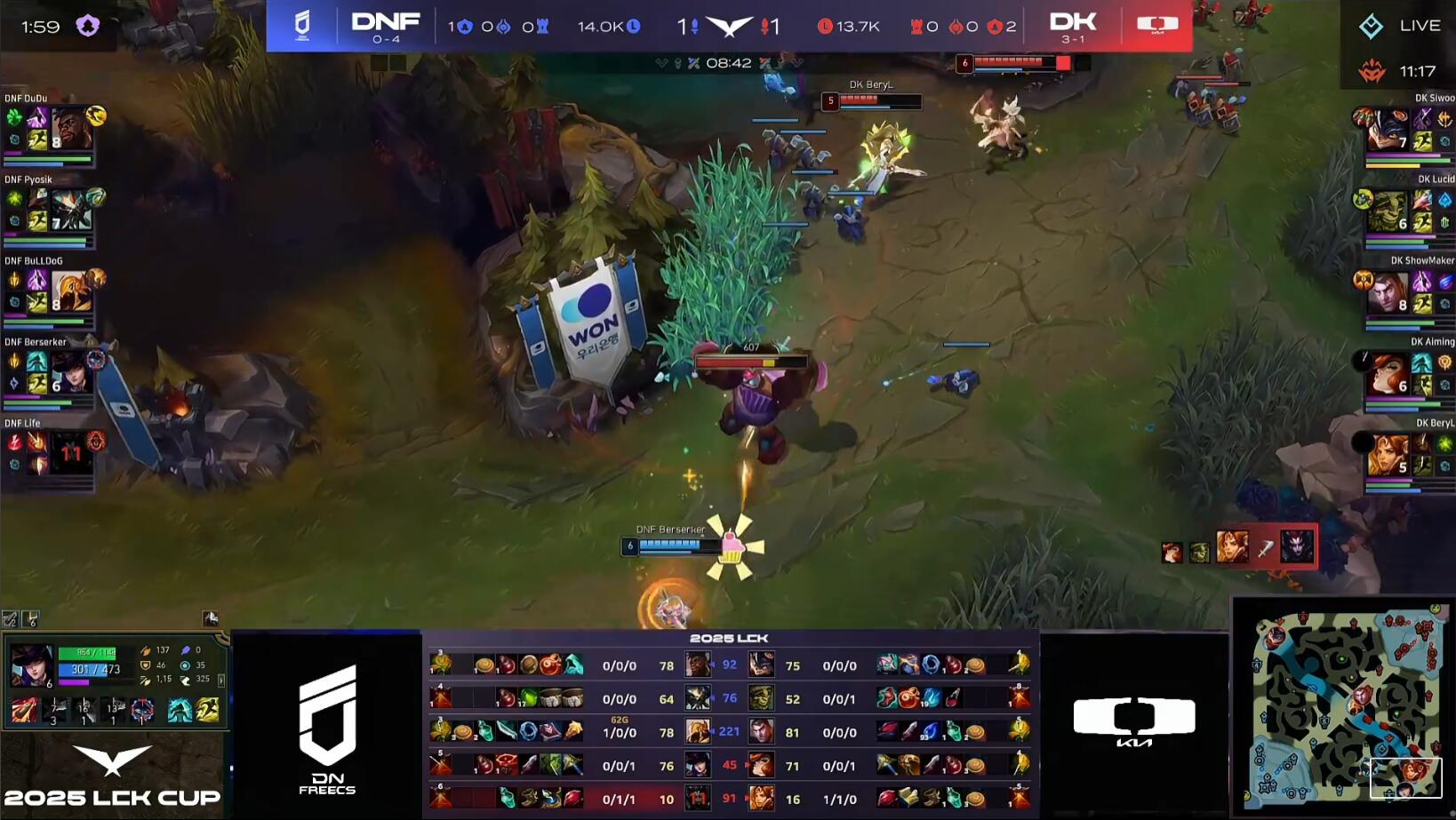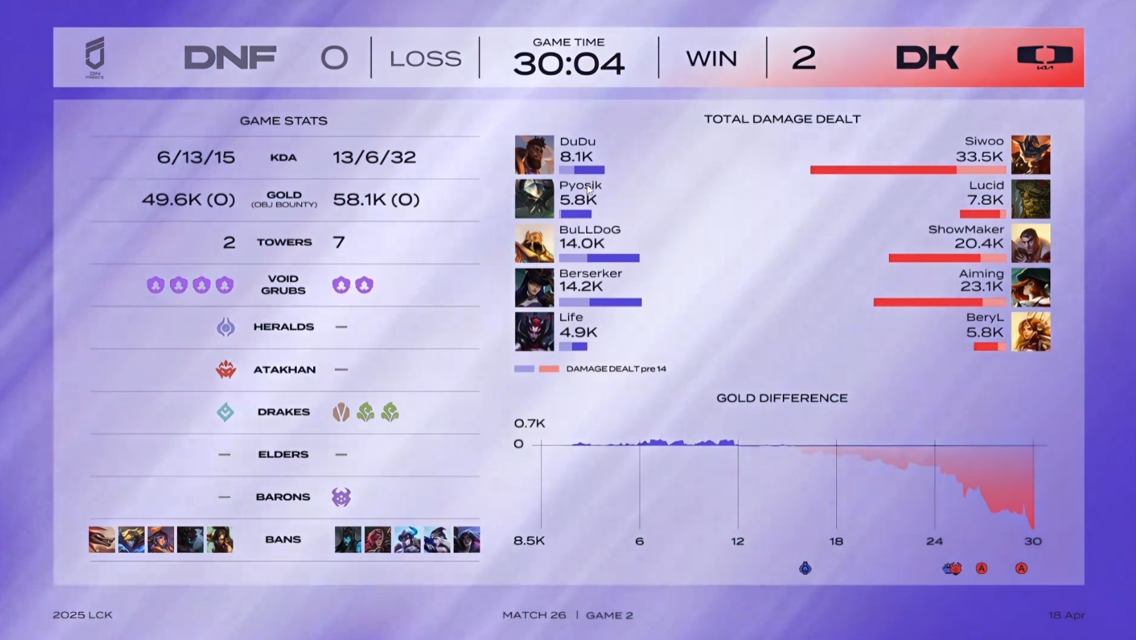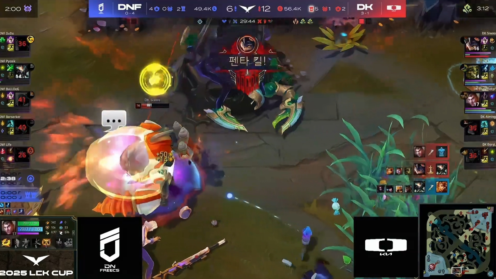后期中路团战BuLLDoG沙皇空大,Siwoo兰博伤害爆炸两鱼叉带走BuLLDoG,DK打出1换5团灭DNF,经济优势来到7k。最终DK下路推进,Siwoo兰博狂烤五杀,DK推平DNF基地拿到比赛胜利。
