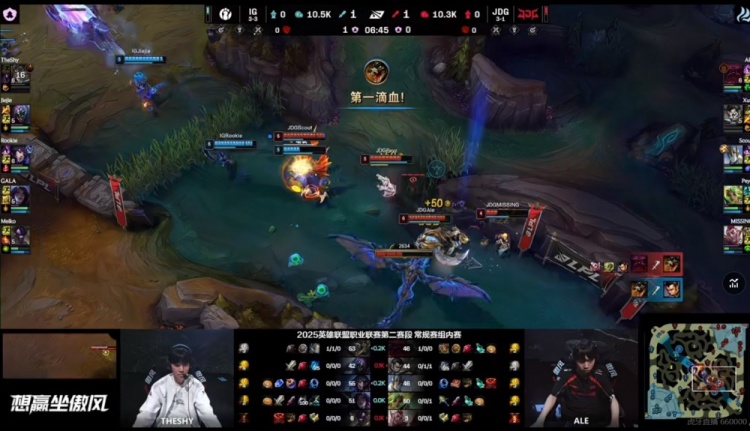 【6:45】河道TheShy鳄鱼一打三直接强杀Xun赵信拿下一血!不过JDG支援到位。Ale奥恩大招击飞三个!JDG换掉了鳄鱼+Meiko牛头!打出1换2!随后JDG还可以拿下两只巢虫!