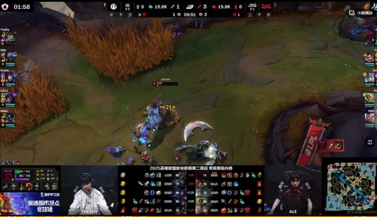 【9:51】TheShy鳄鱼先动手但是反被Ale奥恩大招+头槌命中完成单杀!Rookie阿狸赶到魅惑命中收下了终结赏金!JDG还可以拿下第一条小龙!