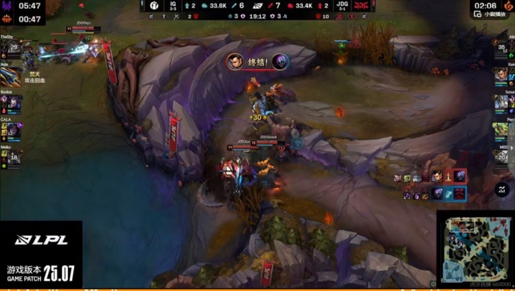 【32:58】JDG直接开大龙,但是MISSING洛直接被集火秒了!残局Scout加里奥大招护阵型,Peyz泽丽交闪拉扯之后超限爆闪直接输出拿下双杀!再过墙躲过了Rookie阿狸的魅惑!GALA卡莎开飞也击杀掉了Xun赵信,多个人的JDG拿下关键的小龙!iG则是剩下双C安全撤退!